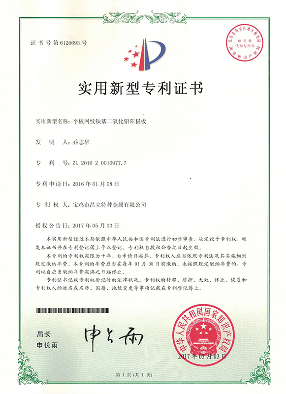 鈦基二氧化鉛陽極板實用新型專利證書