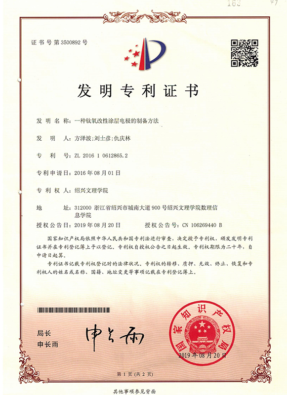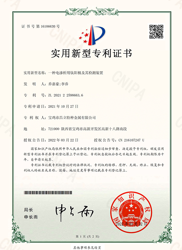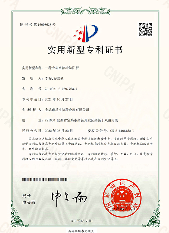 次氯酸鈉發生器用鈦陽極專利證書